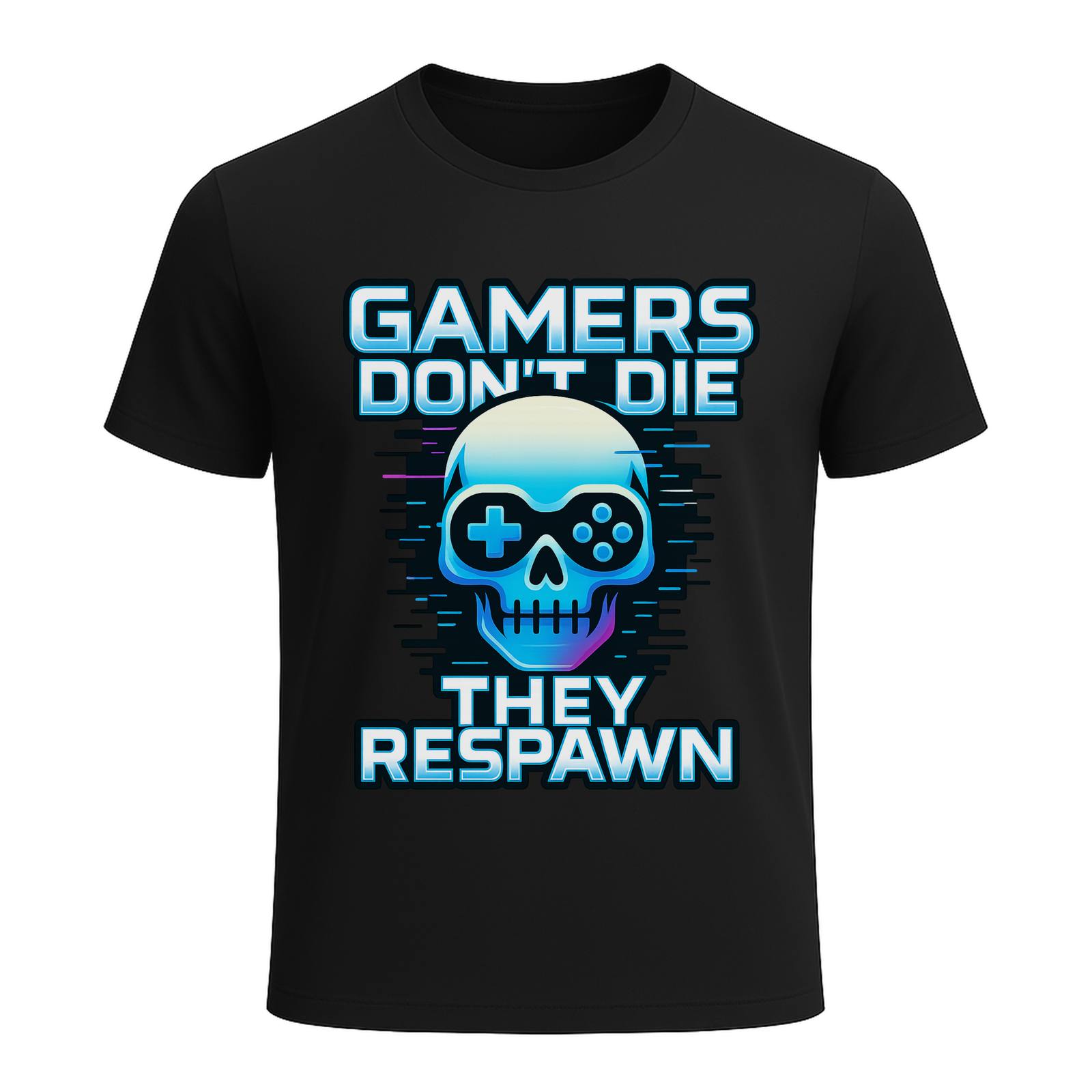 A must-have for gamers — this bold tee features the phrase ‘Gamers Don’t Die, They Respawn’ with a striking skull-and-controller graphic. Perfect for anyone who lives life one respawn at a time.
