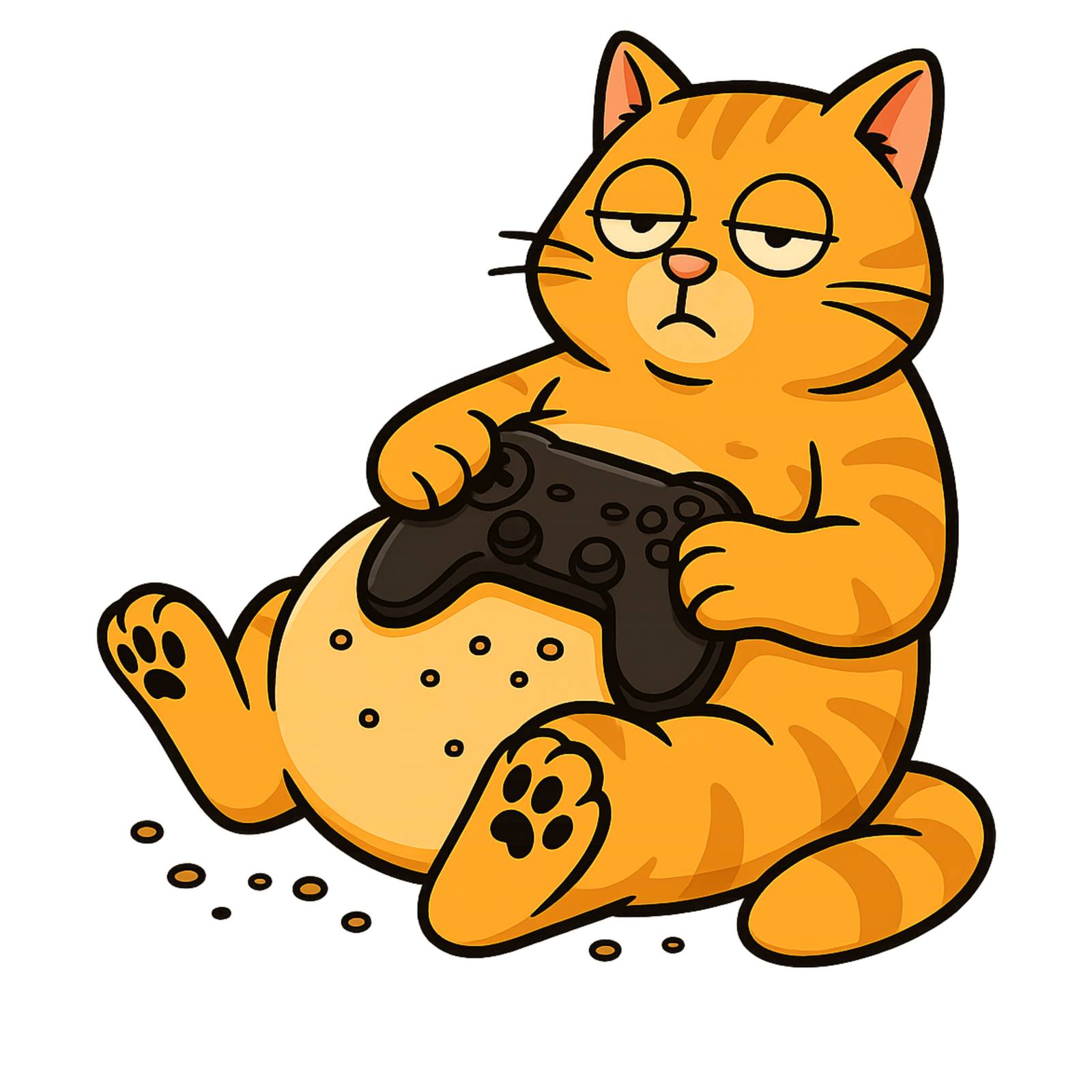 🐱 Cartoon-style chubby cat illustration with controller and crumbs