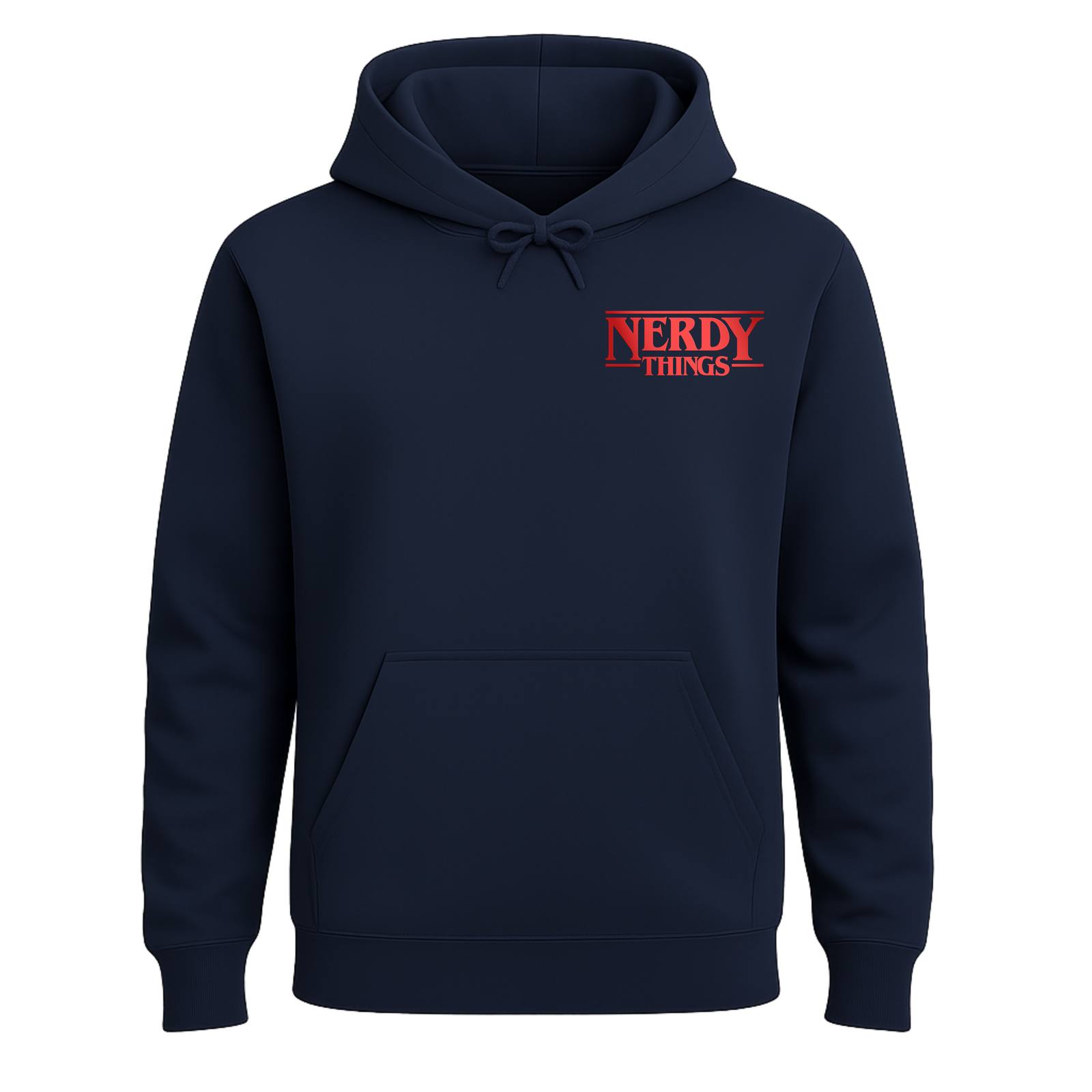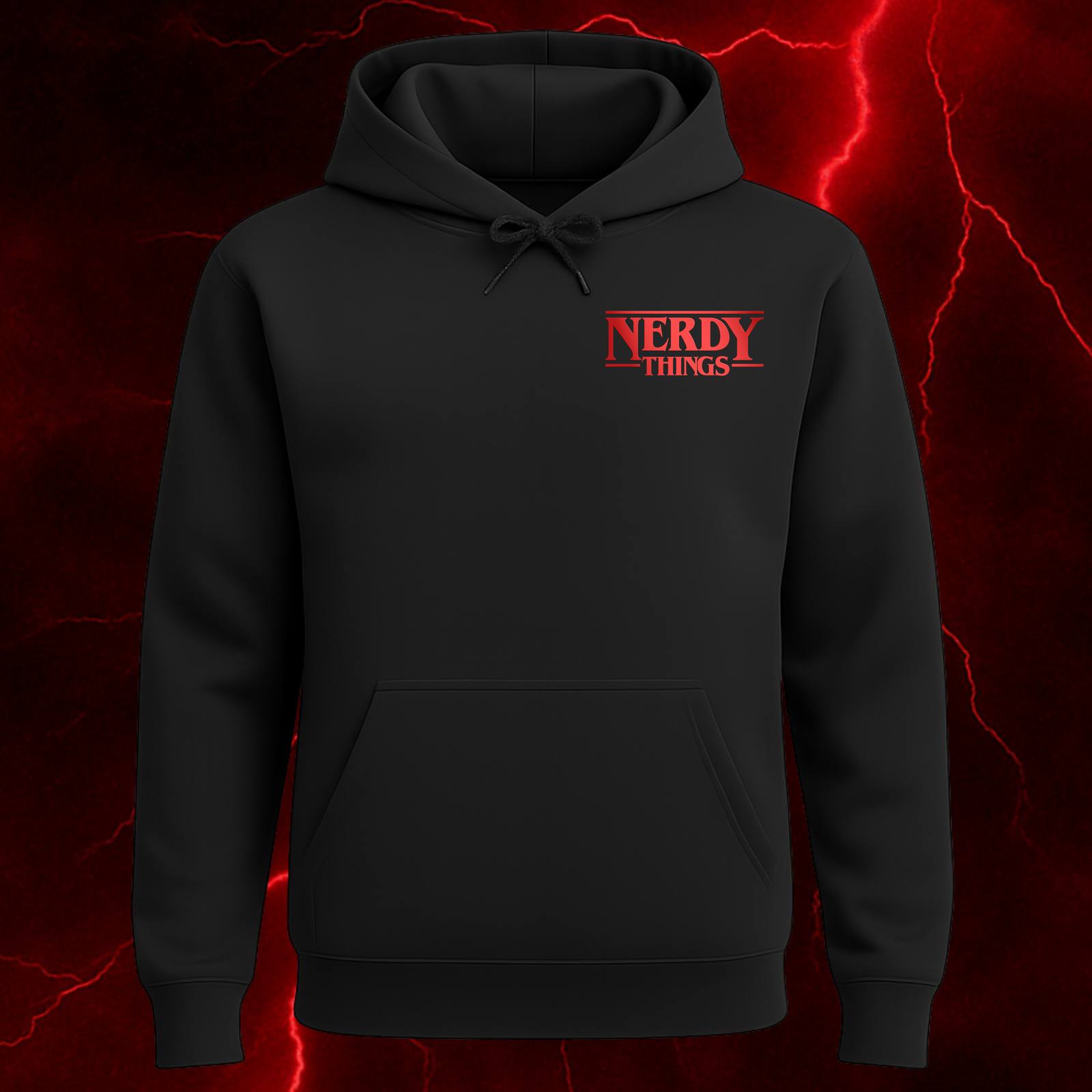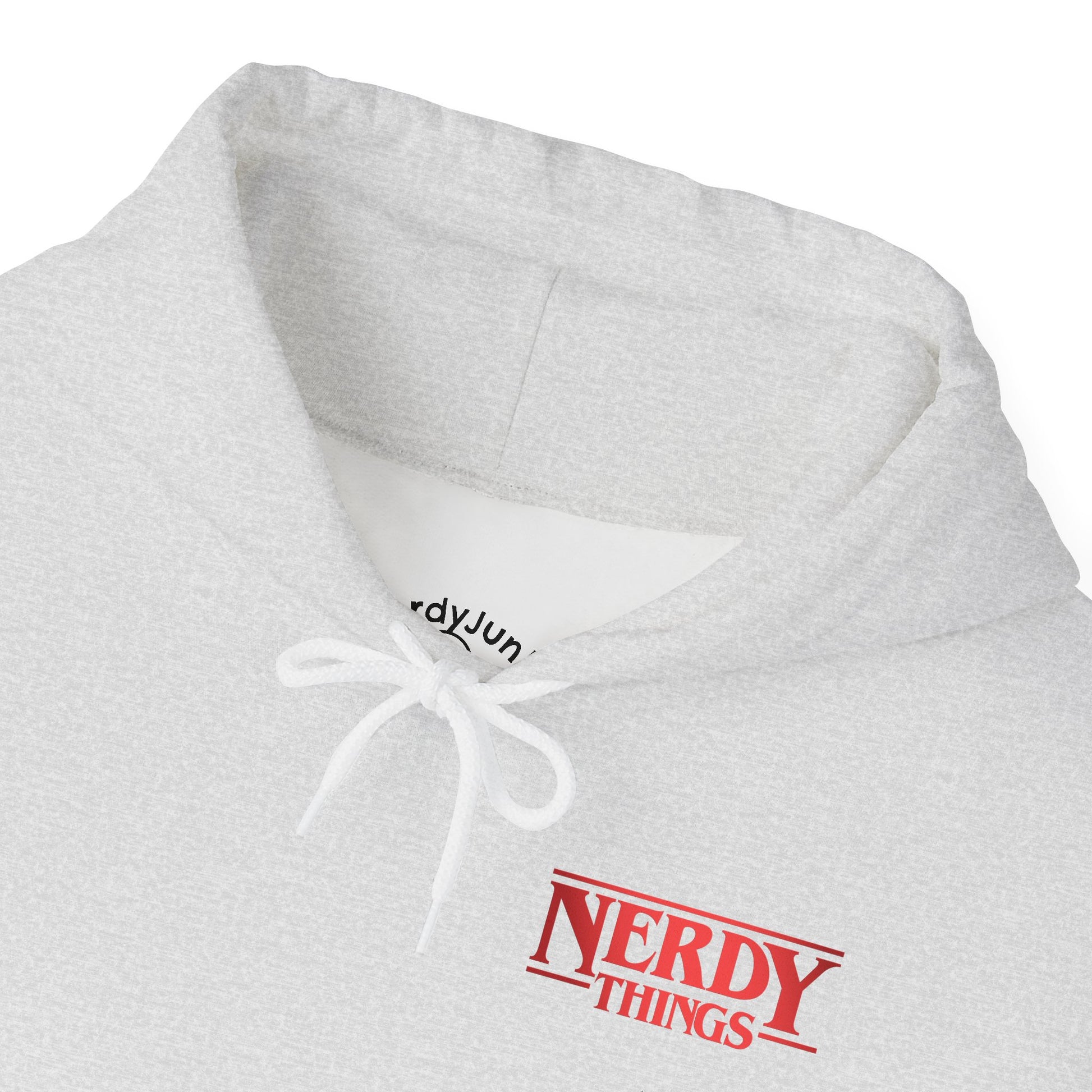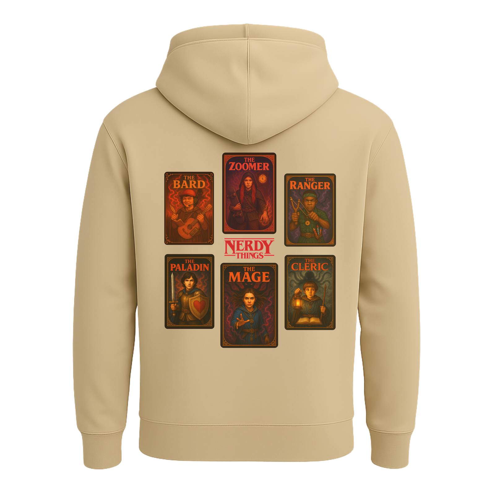This cozy hooded sweatshirt is made to be lived in — soft, warm, and quietly clever. A small, vintage-inspired chest logo reads “NERDY THINGS,” while the back displays six moody, tarot-style class portraits (Bard, Paladin, Zoomer, Mage, Ranger, Cleric) that invite double-takes and conversations. The pouch pocket and double-lined hood make it practical for chilly evenings or long gaming sessions. Subtle, rich colors on a clean white canvas give the hoodie a retro-fantasy vibe that feels both nostalgic and modern.