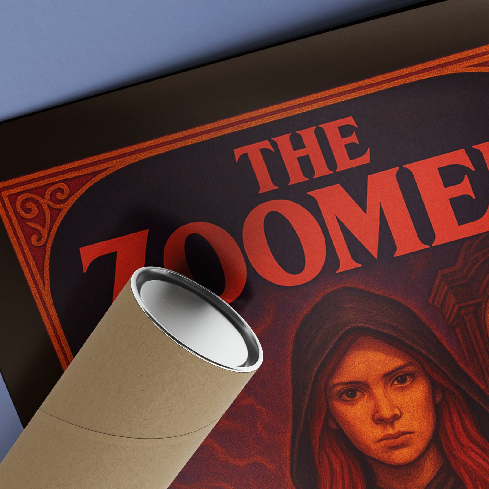 The Zoomer blends a vintage grainy fantasy-card look with a modern twist. With a hooded figure, glowing hand, and a looming grandfather clock in the background, this poster is perfect for fans of TV shows filled with mystery, eerie moments, and strong character focus. The warm reds, retro borders, and textured style make it feel like a classic DnD card pulled from an old set. Simple, bold, and full of atmosphere. Printed on high-quality stock and great for wall display. A solid pick for anyone who enjoys nostalgic artwork with a bit of attitude.