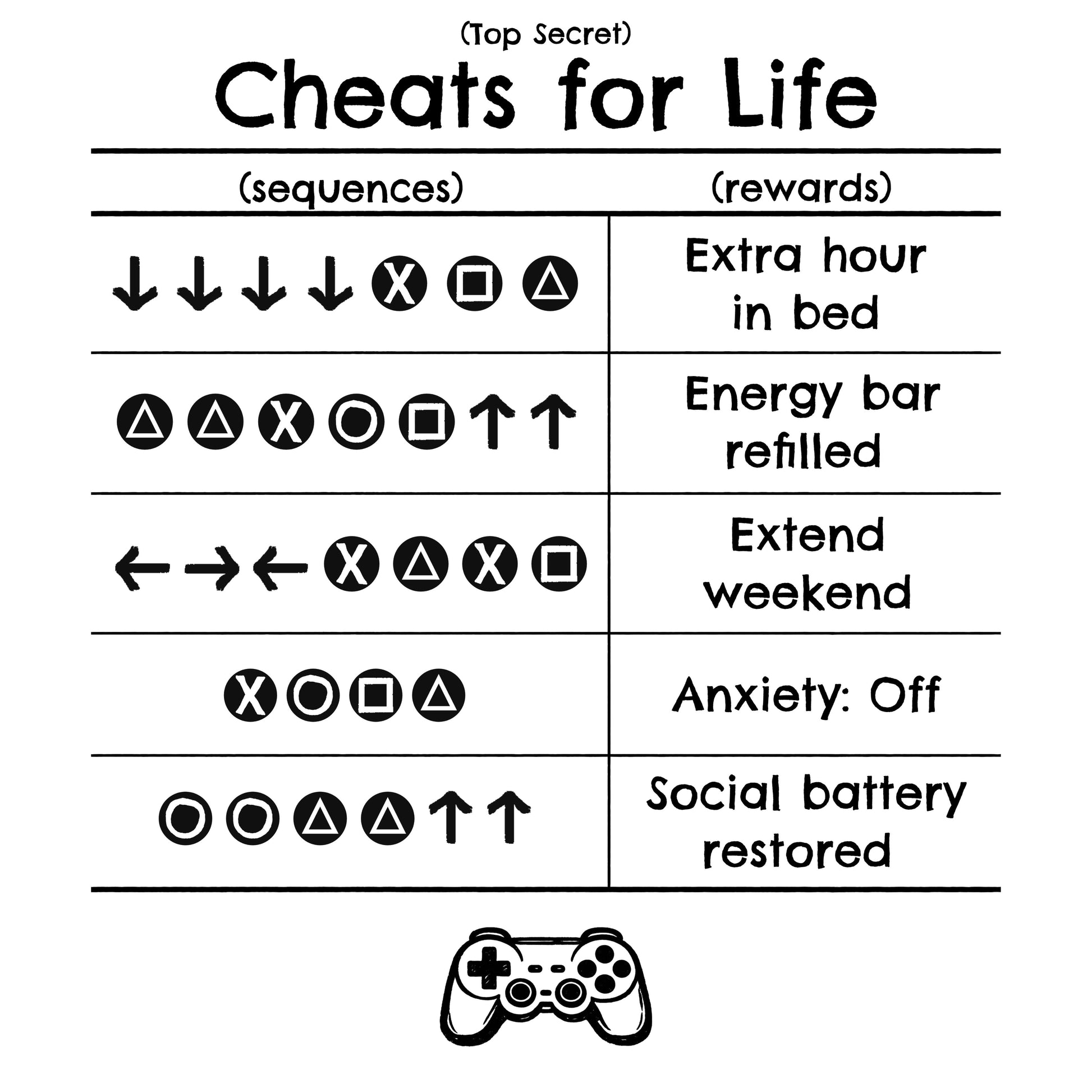 This one’s for the cheaters out there. Inspired by the classic button combos we all tried to memorize, this design imagines a world where everyday problems can be solved with a simple cheat code. Need a little boost? Try “+1 hour in bed,” “Extend weekend,” or “Energy bar refilled.” Feeling drained? Hit “Social battery restored.” And when life gets overwhelming, there’s always the ultimate hack: “Anxiety: off.”