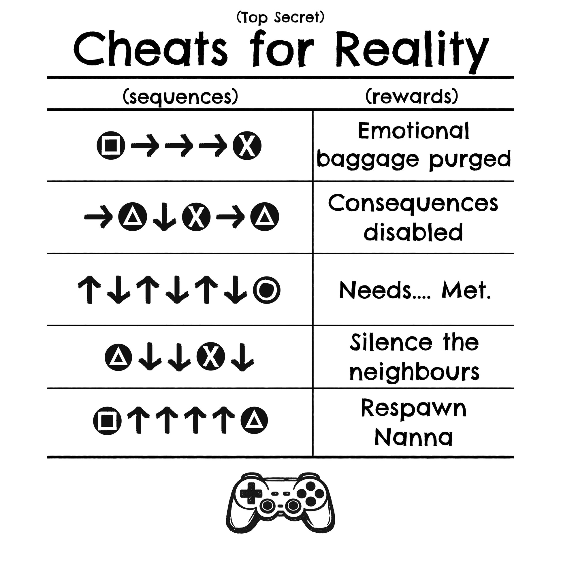 This one’s for the cheaters with a slightly twisted sense of humour. Inspired by the secret combos of old-school games, this design imagines a world where real life came with a few questionable shortcuts. Need a fresh start? Try “Emotional baggage purged.” Feeling reckless? Hit “Consequences disabled.” For those quiet nights alone, take advantage of “Needs… met.” On noisy, stressful days, make the most of “Silence the neighbours.” And for when you’re really missing her… “Respawn Nanna.”