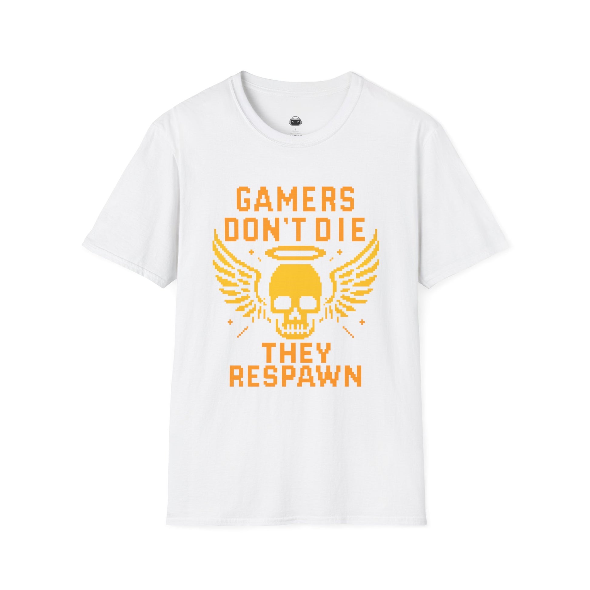 A must-have for gamers — this gold 8bit tee features the phrase ‘Gamers Don’t Die, They Respawn’ with an angelic skull graphic complete with wings and a halo. Perfect for anyone who lives life one respawn at a time.