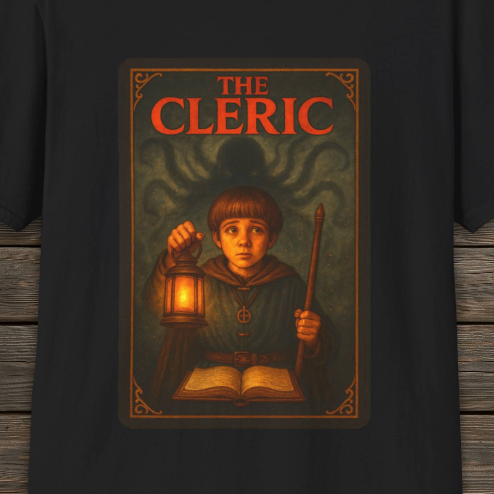 The Cleric blends eerie, storybook-style artwork with a classic fantasy character-card feel. It’s designed for fans of atmospheric TV shows, mystery-driven plots, and stories where every character brings something unique to the group. With its lantern-lit scene, subtle supernatural undertones, and richly detailed illustration, this tee captures the quiet strength of the party’s guide—the one who brings light into the dark. Striking artwork, soft fabric, and easy everyday wear. A great pick for anyone who loves character-focused storytelling and vintage fantasy aesthetics.